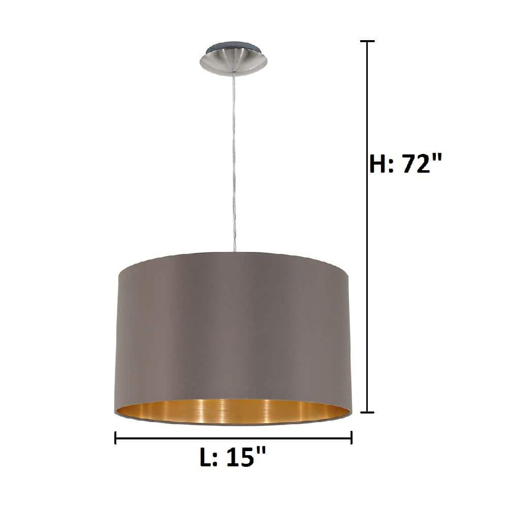 The Maserlo family brings a modern touch to the original shade fixture. The Cappucino cloth shade surrounds the shiny textured gold interior lining. The fixture is light weight which makes for easy installation.. Chandelier/Pendant Design: Shaded. Compatible Bulb Type: LED. Damp/Wet Rating: Dry Rated. Decorative Accents: No Decorative Accents. Dimmable Capability: Dimmable. Features: Adjustable Hanging Length. Fixture Color Family: Silver. Fixture Color/Finish: Satin Nickel. Fixture Material: Metal. Fixture Shape: Cylinder. Hanging Device: Wire. Included: Mounting Hardware Included. Light Bulb Base Code: E26. Light Bulb Type Included: No Bulbs Included. Light Direction: Ambient. Location Use: Bedroom,Dining Room,Foyer,Kitchen Island,Living Room. Max. Bulb Wattage (W): 60 W. Minimum Hanging Length (in.): 72 in. Number of Lights: 1. Power Source: Hardwired. Product Weight (lb.): 2.71 lb. Recommended Light Bulb Shape: Pear. Recommended Light Bulb Shape Code: A19. Returnable: 90-Day. Shade Color Family: Multicolored. Shade Material: Metal. Shape: Drum. Style: Contemporary. Volt (v): 120. Certifications and Listings: ETL Listed. Chain Length (in.): 72 in. Fixture Height (in.): 72 in. Fixture Weight (lb.): 2.71 lb. Fixture Width (in.): 15 in. Maximum Hanging Length (in.): 72 in. Mounting Plate Height (in.): 1.25 in. Mounting Plate Width (in.): 4.7 in. Product Depth (in.): 15 in. Number of Lights: 1. Fixture Material: Metal. Style: Contemporary. Features: Adjustable Hanging Length. Chandelier/Pendant Design: Shaded. Shape: Drum. Fixture Width (In.): 15 in. Light Bulb Base Code: E26