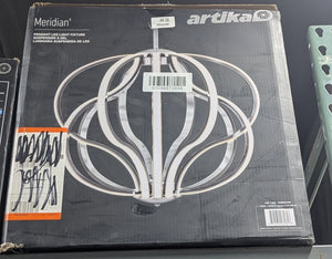 With its inspired, spiraling suspension, Artika's Meridian Chandelier Pendant Light is a true standout. Adored by art lovers, the design is minimalist but oh-so impressive. This hanging chandelier pendant light features a chrome finish and luminously loops that catch the eye. If you favor a modern style, this light adds the magic touch you're looking for. With its LED lights, Meridian offers not only style but also energy efficiency. Fully adjustable, the light installs easily into any room, giving the space a modern aura. Add some art to your daily life with Artika.. Actual Color Temperature (K): 3000. Chandelier/Pendant Design: Cage. Color Rendering Index (CRI): 80. Color Temperature: Warm White. Damp/Wet Rating: Damp Rated. Decorative Accents: No Decorative Accents. Dimmable Capability: Dimmable. Features: Adjustable Hanging Length,Dimmable. Fixture Color Family: Silver. Fixture Color/Finish: Chrome. Fixture Material: Metal. Fixture Shape: Circle. Hanging Device: Wire. Included: Hardware Included. Light Bulb Type Included: Integrated LED. Light Direction: Ambient. Location Use: Bedroom,Dining Room,Foyer,Kitchen Island,Living Room. Lumens: 2100. Minimum Hanging Length (in.): 72 in. Number of Lights: 1. Power Source: Hardwired. Product Weight (lb.): 15.10 lb. Returnable: 90-Day. Shape: Circle. Style: Modern. Volt (v): 120. Watt Equivalence: 30. Certifications and Listings: ETL Certified. Chain Length (in.): 72 in. Fixture Depth (in.): 19.69 in. Fixture Height (in.): 72.01 in. Fixture Weight (lb.): 15.1 lb. Fixture Width (in.): 19.69 in. Maximum Hanging Length (in.): 72 in. Mounting Plate Height (in.): 2 in. Mounting Plate Width (in.): 5 in. Number of Lights: 1. Fixture Material: Metal. Style: Modern. Features: Adjustable Hanging Length. Features: Dimmable. Shape: Circle. Chandelier/Pendant Design: Cage