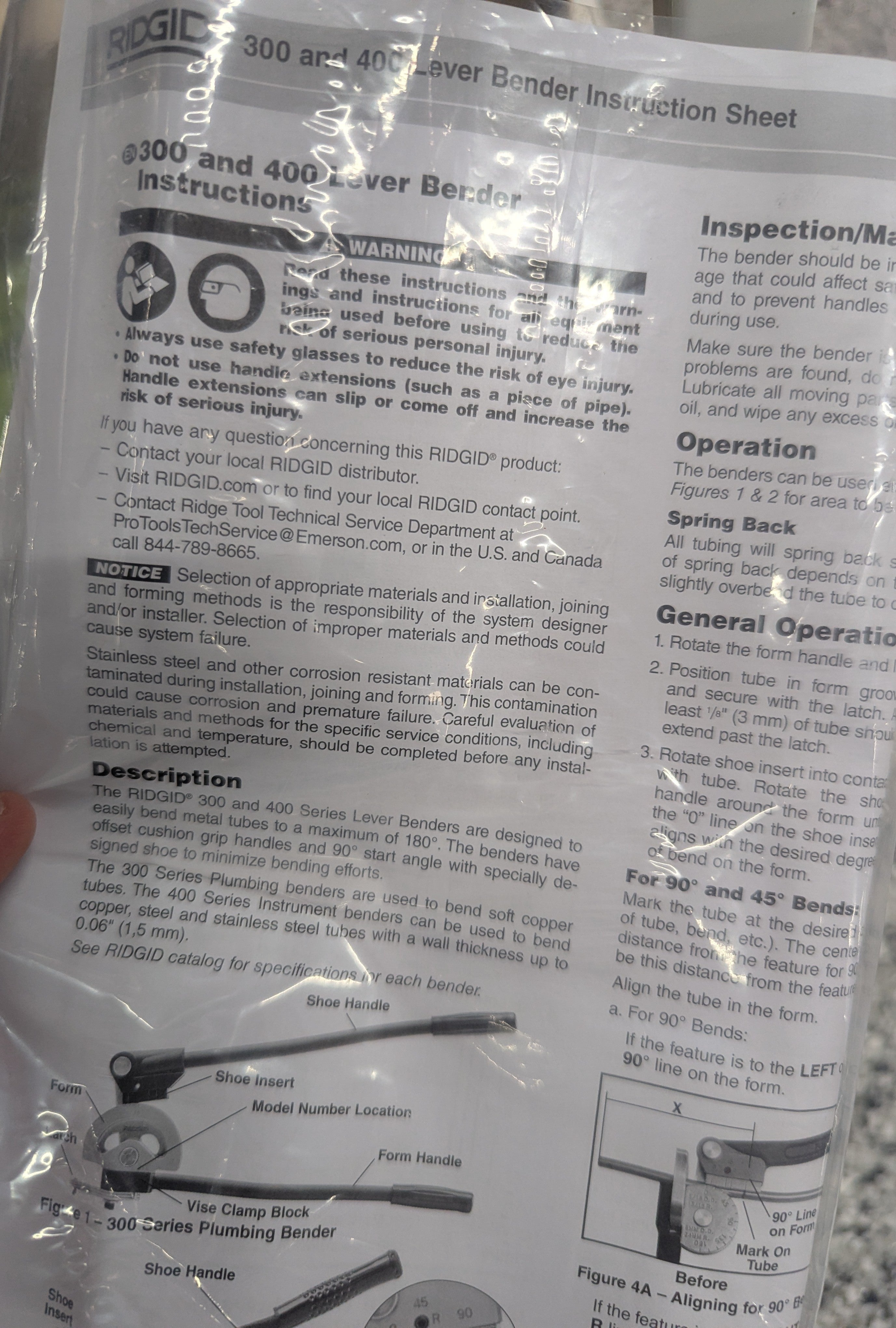 The RIDGID Model 406-Bender with offset cushion grip handles for comfort when forming 180 bends. A 90 start angle and unique oil-absorbing shoe minimize bending effort while forming accurate bends in copper, steel and stainless steel tubing. Weight: 29 lbs. RIDGID - Built For Those Who Know.. Compatible Pipe Material: Multi-Purpose. Pack Size: 1. Pipe Cutter Type: Wheel. Power Type: Manual. Product Weight (lb.): 1 lb. Tools Product Type: Hand Tool. Type: Spin. Compatible Pipe Size (in.): 2 in.. Maximum Pipe or Tube Diameter (in.): 1-1/8. Minimum pipe or tube diameter (in.): 0.125. Product Depth (in.): 1.25 in. Product Height (in.): 2.25 in. Product Width (in.): 2.375 in. Compatible Pipe Material: Multi-Purpose. Pipe Cutter Type: Wheel. Power Type: Manual