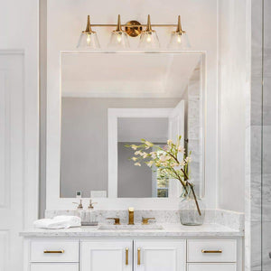 The modern bathroom vanity light by LNC is an immediate delight, blending contemporary and classic design into an eye-catching profile. A gentle round base with a plated brass finish mounts a single, elegantly straight cross-bar with 4 enchanting tampered-drum glass shades. The metal wrapped around the glass shades' top is just like gold accent bands creating visual enjoyment. The inner energy-efficient LED bulbs (sold separately) bring life to the geometry, presenting a soft and gentle glow. Use lighting from the same collection which would make your choices easy without taking the extra time for a match look.. Compatible Bulb Type: CFL,Eco-Incandescent,Fluorescent,LED. Damp/Wet Rating: Damp Rated,Dry Rated. Features: Dimmable,Rust Resistant. Fixture Color Family: Brass. Fixture Color/Finish: Plated Brass (4-Light). Fixture Material: Metal. Included: Mounting Hardware,Shade(s). Light Bulb Base Code: E12. Light Bulb Type Included: No Bulbs Included. Max. Bulb Wattage (W): 40 W. Mounting Position: Non-Directional. Number of Lights: 4. Power Source: Hardwired. Product Weight (lb.): 5.5 lb. Recommended Light Bulb Shape Code: B10. Recommended Vanity Size (in.): 31. Shade Color Family: Clear. Shade Material: Glass. Shade Shape: Bell. Certifications and Listings: UL Listed. Fixture Height (in.): 9 in. Fixture Width (in.): 29 in. Mounting Plate Height (in.): 4.7 in. Mounting Plate Width (in.): 4.7 in. Product Depth (in.): 8 in. Fixture Width (In.): 29 in. Number of Lights: 4. Recommended Vanity Size (in.): 31. Fixture Material: Metal. Shade Material: Glass. Features: Dimmable. Features: Rust Resistant. Shade Shape: Bell