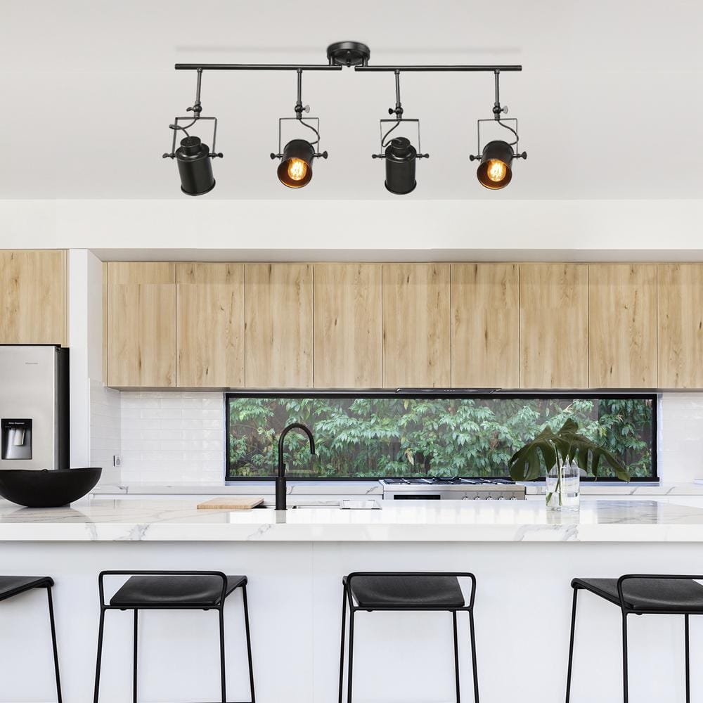 The Modern Rotatable 4-Light Black Wall Track Lighting Kit for Kitchen Modern Dimmable Multi-directional Linear Task Light features durable metal construction accented with matte black finishes, complying well with kitchen island, den, bars, home office, hallway, bedroom, living room. The greatly affordable price makes it a good choice for some commercial areas as well as durability. With adjustable two bars and four lamp heads, no doubt that this track lighting kit is perfect for being multi-directional task lighting to provide light to difficult places where light does not reach. The entire system is easy for ceiling or wall mountable. Shop more modern black lights to match by searching the number below them on the picture.. Compatible Bulb Type: CFL,Incandescent,LED. Damp/Wet Rating: Dry Rated. Features: Adjustable Lamp Head,Dimmable. Fixture Color Family: Black. Fixture Color/Finish: Black. Hardware Included: Yes. Max. Bulb Wattage (W): 40 W. Mount Location: Ceiling Mounted. Mounting Hardware Included: Yes. Movable fixtures: No. Number of Tracks: 1. Power Source: Hard Wired. Product Weight (lb.): 4.9 lb. Shade Color Family: Black. Track Head Type: Gimbal Head. Track Length (ft.): 3 ft.. Track Lighting Type: Fixed Track. Voltage (v): 120v. Certifications and Listings: ETL Listed. Product Depth (in.): 4.7 in. Product Height (in.): 15 in. Product Width (in.): 36.4 in. Track Length (ft.): 3 ft.. Compatible Bulb Type: LED. Features: Dimmable. Features: Adjustable Lamp Head. Track Lighting Type: Fixed Track. Track Head Type: Gimbal Head. Mount Location: Ceiling Mounted. Compatible Bulb Type: Incandescent