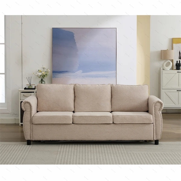 Features Product Type Sofa Design 2-in-1 sofa bed Seating Capacity 3 Frame Material Wood+Iron Leg Material Plastic feet Removable Cushions Yes Country of Origin China Product Dimensions Overall Sofa bed size: 81.5*86.5*33 (L*D*H) Sofa bed size: 81.5*86.5*33 (L*D*H) Arm Height - Floor to Arm 26 Back Cushion 23.5*14.5(L*D) Sofa Weight Capacity 300 lbs / seat Adult Assembly Required Yes Suggested # of People 3 Bed bearing capacity 506 lbs Mattress height 3.35 Foot height 3.14 Seated depth 21 Handrail width 5.5 Memory mattress size 61.22*71.85*3.35 (L*D*H) Notice: 1.Due to the difference between computer display and photography, the color of the pictures and actual products will be slightly different. 2.The packaging of the product package may be updated at any time, please refer to the actual product received. 3. Most of our sofas are hand-measured, therefore the dimensions are for reference only, and may marginally deviate. Product Type: Sofa Upholstery Material: Wood+Metal Upholstery Color: Beige Leg Color / Finish: Beige Frame Material: Solid + Manufactured Wood Fill Material: Foam Cushion Construction: Foam Seating Capacity: 2