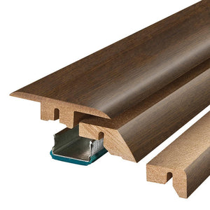 The PERFORMANCE ACCESSORIES 4-in-1 multifunctional molding provides everything you need to complete your laminate flooring installation in 1 single kit. This patented innovation allows assembly of 4 different transition types from a single product, saving you time and money. That means you can be sure you'll always have the right piece when you start your installation. Use in doorways or join 2 sections of hard surface flooring with an equal height with the T-molding. Use the reducer to transition from laminate to tile, vinyl or hard surfaces of a different height. The end-molding configuration allows you to transition to carpet or to finish your laminate flooring installation at sliding doors, fireplaces or other fixed edges. For best results, try laying out your moldings in the area where they will be installed before installing flooring planks. That way you can choose the plank that meets the transition to best fit your desired look. Coordinating stairnose and wall transitions are available to complete the finished look. Finish your flooring installation with coordinated molding. 4-molding needs in 1-solution for laminate wood floors. Covers the length of 2-standard doorways. PERFORMANCE ACCESSORIES 4-in-1 laminate floor molding. All moldings in kit are 6-1/2 ft. length. T-mold and carpet reducer measure 1.75 in. wide. Hard surface reducer measures 2 in. wide. 4-in-1 molding matches a variety of laminate flooring options available in store and online. Can be used with flooring up to 15mm thick. Design includes T-molding, carpet transition, hard surface reducer and end molding. T-molding joins 2 hard surfaces of similar heights. Carpet transition joins hard surface to carpeted surface. Hard surface reducer joins 2 hard surfaces of differing heights. End molding provides a solution at fixed edges. No painting or staining necessary. Appropriate Grade for Installation: Below Grade, On Grade and Above Grade. Can be installed over smooth, flat, dry surfaces: concrete, ceramic tile, vinyl and wood. Residential use only. Color Family: Brown. Color/Finish: Java Scraped. Finish Type: Textured. Flooring Compatibility: All Purpose. Flooring Look: Wood Look. Flooring Product Type: Laminate Moulding/Trim. Gloss: High Gloss. Indoor/Outdoor: Indoor. Installation Method: Screw Down. Laminate Flooring Features: Easy Install, Floating, No waxing or polishing needed, Scratch resistant. Location: Basement, Bathroom, Kitchen, Mudroom, Sunroom. Material: Laminate. Water Protection: No Water Protection. Certifications and Listings: CARB Compliant. Product Length (in.): 78.75 in. Product Thickness (in.): 0.75 in. Product Width (in.): 2.37 in. Width (in) x Length (in): 2.37in x 78.75 in.