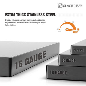 Glacier Bay Under Mount R0 Tight Radius Corner Handmade WorkStation Kitchen Sink can keep your kitchen looking chic, with an under mount format that fits seamlessly beneath countertops and cabinetry of every configuration. Made of durable 16-Gauge brushed stainless steel, the tight radius corners provide an elegant appearance and easy cleaning. Equipped with practical accessories to decrease food prep time and a bottom grid to protect the bottom surface and prevent scratching.. Bowl Split: No Split. Bundle Type: Workstation Sink w/Accessories. Color Family: Silver. Color/Finish: Stainless Steel. Drain Location: Right. Faucet Included: Without Faucet. Features: Corrosion Resistant,Sound Dampening,Tight/Zero Radius,Workstation. Included: Basin Rack,Bottom Grids,Drain Cap,Mounting Hardware. Kitchen Product Type: Kitchen Sink. Minimum Cabinet Size (in.): 30. Mount Type: Undermount. Number of Bowls: Single Bowl. Number of Faucet Holes: 0. Product Weight (lb.): 39.087 lb. Returnable: 90-Day. Sink Finish Type: Brushed. Sink Gauge: 16 Gauge. Sink Material: Stainless Steel. Sink Shape: Rectangular. Certifications and Listings: IAPMO Certified. Bowl 1 Front to Back Width (in.): 17 in. Bowl 1 Left to Right Length (in.): 25 in. Bowl 1 Top to Bottom Depth (in.): 10 in. Bowl 2 Front to Back Width (in.): 0 in. Bowl 2 Left to Right Length (in.): 0. Bowl 2 Top to Bottom Depth (in.): 0. Sink Front to Back Width (in.): 19 in. Sink Left to Right Length (in.): 27 in. Sink Top to Bottom Depth (in.): 10 in. Mount Type: Undermount. Sink Material: Stainless Steel. Sink Left to Right Length (in.): 27 in. Number of Bowls: Single Bowl. Sink Gauge: 16 Gauge. Drain Location: Right. Sink Shape: Rectangular. Number of Faucet Holes: 0