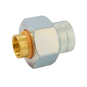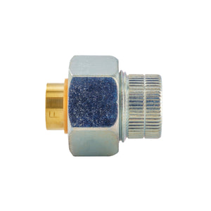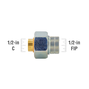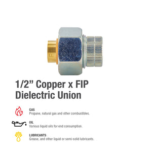ProLine Series' Dielectric Unions are the choice to prevent galvanic corrosion in commercial and residential piping systems. Installed between two pipes made of different metals, these quality fittings protect your systems by utilizing an insulating gasket insert to eliminate the electrical current development that could lead to piping deterioration. Dielectric unions are available with various connections of galvanized steel or lead-free compliant brass. - Connects two lengths of pipe of dissimilar materials - Helps to prevent corrosion caused by galvanic action or electrolysis - For use with water up to 210 F - Union includes insulator sleeve and rubber washer - Solder connections comply to ANSI B16.18 - Threaded connections comply with ANSI B1.20.1 - Color/Finish Family: Gold - Sub Type: Dielectric union - Type: Union - Diameter (End 1): 1/2-in - Diameter (End 2): 1/2-in - Connection Type (End 1): Female - Connection Type (End 2): Cup (solder) - Fitting Type: Threaded - For Use with RVs: No - Material: Brass - Maximum Working Temperature (Fahrenheit): 180 - Minimum Working Temperature (Fahrenheit): 32 - Package Quantity: 1 - CA Residents: Prop 65 Warning(s): Yes - Complies with Federal Lead Guidelines: Yes - Safety Listing: IAPMO safety listing - UNSPSC: 40171700