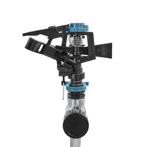 Durable Pulsating Sprinkler on Metal Spike showers a gentle rain of water to keep your lawn and garden healthy all season. Cover an area with up to an 85 ft. dia (up to 5,670 sq. ft. ), great for watering large yards and gardens. Adjust the spray distance or spray angle to fit your watering needs. Connect multiple units in a series to reach an even larger area. The sturdy metal spike is easy to place, even in hard soil. Keep your lawn green and garden growing for seasons to come.. Adjustable: Yes. Base Material: Aluminum. Commercial / Residential: Residential. Decorative: No. Maximum Pressure (PSI): 120 psi. Maximum Spray Distance (ft.): 65. Motion Sensor: No. Sprinkler Base Type: Spike. Coverage Area (sq. ft.): 5670 sq ft. Fitting Size: 5/8. Product Depth (in.): 2.16 in. Product Height (in.): 11.81 in. Product Width (in.): 4.92 in. Maximum Spray Distance (ft.): 65. Sprinkler Base Type: Spike