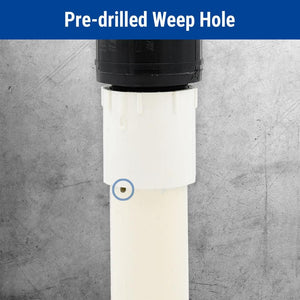 The easy to use Quick Connect Pipe comes fully assembled to make installation of a sump pump quick and easy. Included in the assembly is a 1.5 in. coupling, 1.5 in. check valve, pre-cemented female adapter, pre-drilled weep hole to prevent airlock, discharge pipe, and a pre-cemented male adapter. This assembly saves you from having to buy each individual adapter, PVC, primer and cement.. Brand Compatibility: Universal. Pack Size: 1. Returnable: 90-Day