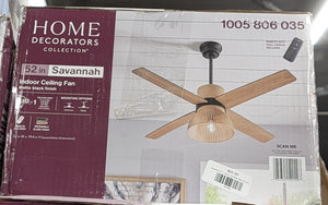 Add a beautiful focal point to your indoor living space with the 52 in. Savannah ceiling fan from Home Decorators Collection. Inspired by natural elements and textures, this ceiling fan sets itself apart from the ordinary. The Savannah ceiling fan features a powerful and quiet 3-speed reversible motor for year round comfort. The matte black finish is complemented with a decorative wood tone light kit and 4 reversible blades in pecan and matte black finishes. The dimmable light kit uses a clear 6.5-Watt medium base LED bulb (included). Control is at your fingertips with the included handheld remote to operate the fan's 3-speeds and light. A wall cradle is included to store the remote when not in use.. Actual Color Temperature (K): 2700. Blade Color: Matte Black;Pecan. Blade Color Family: Black,Brown. Blade Material: Plywood. Blade Pitch: 12. Ceiling Fan Design: Standard. Ceiling Fan Size: Medium. Color Temperature: Warm White. Commercial/Residential: Residential. Compatible Bulb Type: LED. Control Type: Remote. Damp/Wet Rating: Dry Rated (Indoor). Dimmable Capability: Dimmable. Durability: Not Applicable. Features: Dimmable,Quick & Easy Install,Reversible Blades,Reversible Rotation. Housing Color: Matte Black. Housing Color Family: Black. Housing Material: Steel. Included: Downrod Included,Light Bulb(s) Included,Light Kit Included,Mounting Hardware Included,Remote Control Included,Shade(s) Included. Indoor/Outdoor: Indoor. Light Bulb Base Code: E27. Light Bulb Type Included: LED. Location Use: Bedroom,Foyer,Kids Room,Living Room,Nursery,Office. Lumens: 810. Max. Airflow (CFM): 5897. Max. Bulb Wattage (W): 6.5 W. Max. Motor Speed (RPM): 178. Motor Type: AC. Mounting Type: Angled Mount,Downrod Mount. Number of Blades: 4. Number of Lights: 1. Number of Speeds: 3. Recommended Room Size: Large Room (400 sq. ft.). Shade Material: Plastic. Shade Shape: Round. Style: Global. Certifications and Listings: FCC Listed,UL Listed. Assembled Depth (in.): 52.00 in. Assembled Height (in.): 19.40 in. Assembled Weight (lbs.): 15.87. Assembled Width (in.): 52.00 in. Blade Length (in.): 24.4 in. Blade Width (in.): 5.5 in. Downrod Length (in.): 6. Fan Blade Span (in.): 52 in. Fan Blade Span (in.): 52 in.. Recommended Room Size: Large Room (400 sq. ft.). Number of Blades: 4. Mounting Type: Downrod Mount. Indoor/Outdoor: Indoor. Location Use: Bedroom. Motor Type: AC