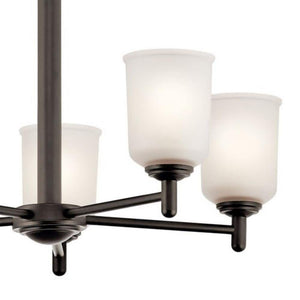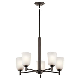 The Kichler Shailene 15.25 in. 5-Light Olde Bronze Chandelier features a classic look with clean lines. Its up-sized satin etched glass shades ensure even diffusion of soft light throughout the room. With an attractive bronze frame finish, this chandelier adds a touch of urban elegance to your home decor. It comes with a kit that enables secure, hassle-free installation on sloped ceilings.. Chandelier/Pendant Design: Tier. Decorative Accents: No Decorative Accents. Dimmable Capability: Dimmable. Features: Adjustable Hanging Length. Fixture Color Family: Bronze. Fixture Color/Finish: Olde Bronze. Fixture Material: Steel. Fixture Shape: Circle. Glass Shade Type: Etched Glass. Included: Downrod Included,Hardware Included. Light Bulb Base Code: E26. Light Bulb Type Included: No Bulb(s) Included. Location Use: Dining Room,Kitchen Island. Max. Bulb Wattage (W): 100 W. Minimum Hanging Length (in.): 36 in. Number of Lights: 5. Product Weight (lb.): 13.64 lb. Recommended Light Bulb Shape: A-Shape. Returnable: 90-Day. Shade Color Family: White. Shade Material: Glass. Style: Classic,Traditional,Transitional. Volt (v): 120. Certifications and Listings: ETL Listed. Fixture Width (in.): 23.75 in. Maximum Hanging Length (in.): 55.75 in. Mounting Plate Width (in.): 5 in. Product Depth (in.): 23.75 in. Product Length (in): 15.25 in. Number of Lights: 5. Fixture Shape: Circle. Style: Transitional. Style: Traditional. Style: Classic. Features: Adjustable Hanging Length. Fixture Material: Steel. Location Use: Dining Room