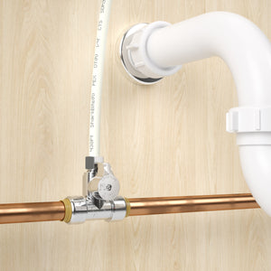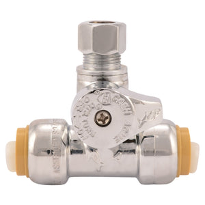 The SharkBite tee stop allows you to easily tap into an existing or new plumbing line and run a 3/8-in compression line out to an end fixture. Perfect for adding a humidifier or ice maker to new or existing plumbing. The integrated quarter turn valve allows for easy on/off control of the supply line. The SharkBite push-to-connect ends allow you to simply push on to copper, PEX, pert and CPVC with no solder, clamps, unions or glue. Just insert the pipe and the stainless steel teeth bite down and grip tight, while a specially formulated o-ring compresses to create a perfect seal. Dis-assembly is just as fast using the simple disconnect tool so fittings and valves can be easily changed and reused. Lead free chrome-plated DZR brass construction for durability and reliability Fastest way to add a water supply line to new or existing plumbing Quarter-turn valve for easy on/off operation Connect to any combination of PEX, copper, CPVC or PE-RT 3/8-in OD compression outlet tee Quarter-turn valve for easy on/off flow control Demount clip allows user to release the fitting from the pipe for convenient installation flexibility (sold separately) Type: Supply stop Inlet Diameter: 1/2-in Inlet Size in Inches: 1/2-in Outlet Diameter: 3/8-in Inlet Thread Type: Push-to-connect Material: Brass Maximum Pressure: 125 PSI Outlet Thread Type: OD Compression Package Quantity: 1 Turn: Quarter turn CA Residents: Prop 65 Warning(s): Yes Complies with Federal Lead Guidelines: Yes UNSPSC: 40141600