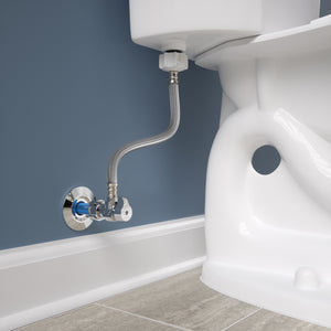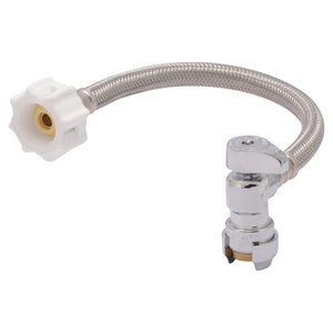 The 1/2-in SharkBite CLICK SEAL toilet connector is the easiest way to install a new toilet line. The valve is perfect for potable water and hydronic applications where a shut-off is needed. Using SharkBite fittings is the easiest way to join copper, CPVC or PEX pipe in any combination with no soldering, clamps, unions or glue. Just insert the pipe and the stainless steel teeth bite down and grip tight, while a specially formulated O-ring compresses to create a perfect seal. Disassembly is just as fast using the simple disconnect tool so fittings and valves can be easily changed and reused. They can even be rotated after assembly for easier installation in tight spaces. SharkBite fittings are certified for potable water supply and hydronic heating applications. The CLICK SEAL technology also means there is no need for tools, simply turn the CLICK SEAL nut until it clicks and you have a secure seal. Push-to-connect design makes for quick and easy install Click-seal nut provides an audible click to ensure a sealed connection without the need to use tools to install Connects to PEX, copper, CPVC or PE-RT 1/2-in inlet 7/8-in ballcock outlet Quarter-turn valve for easy on/off flow control Demount clip allows user to release the fitting from the pipe for convenient installation flexibility (sold separately) Finish: Chrome Inlet Diameter: 1/2-in Inlet Fitting Size (Inches): 0.5 Inlet Size in Inches: 1/2-in Length (Inches): 12.0 Outlet Diameter: 7/8-in Outlet Fitting Size (Inches): 0.875 Outlet Size in Inches: 7/8-in Size and Fitting Type: Universal Tube Diameter (Inches): 0 Flexible: Yes Inlet Fitting End Type: Push Maximum PSI: 200.0 Outlet Fitting End Type: Ballcock thread Package Quantity: 1 Rigid: No Tubing Material: Braided stainless steel Use: Toilet Working Temperature Range: 32 to 200 degrees F CA Residents: Prop 65 Warning(s): Yes Complies with Federal Lead Guidelines: Yes UNSPSC: 40142000