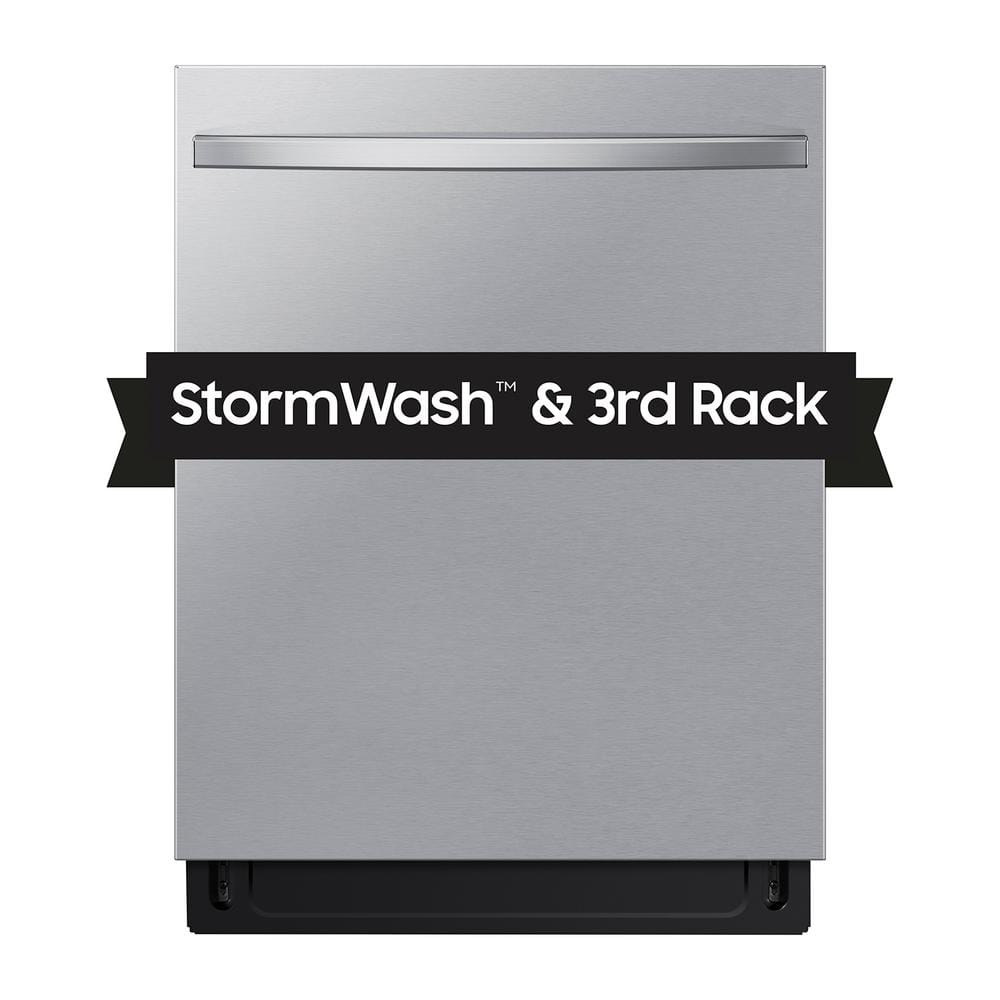 Powerful StormWash rotating jets let you skip the pre-rinse, delivering heavy-duty cleaning from every angle. The AutoRelease Door delivers improved drying performance. A convenient 3rd rack enables you to load everything more efficiently.. Amperage (A): 15 A. Appliance Category: Dishwasher. Appliance Series: Not Applicable. Appliance Type: Dishwasher. Color/Finish: Stainless Steel. Color/Finish Family: Stainless Steel. Control Location: Top Control. Control Type: Touch. Custom Door Panel Ready: No. Decibel (Sound) Rating: 46 dBA. Dishwasher Features: 3rd Rack,Automatic Door Release,Leak Sensor,Tall Tub. Dishwasher Rack Configuration: 1st Rack- Removable. Dishwasher Wash Cycles: Auto,Delicate,Quick Wash,Standard Wash. Dry Options: Delay Start,High Temperature Wash. Energy Consumption (kWh/year): 239. Energy Efficiency Tier Rating: Not CEE rated. Handle Type: Bar Handle. Hardware Color/Finish: Stainless Steel. Hardware Color/Finish Family: Stainless Steel. Hose Length (ft.): 4 ft. Number of Cycles: 7. Number of Place Settings: 15. Power Options: Hardwired. Product Weight (lb.): 84 lb. Rack Material: Other. Remote Access: No Remote Access. Requires Hub?: No Hub Required. Returnable: Non-Returnable. Silverware Basket Location: In Rack. Smart Home: Smart Home Enabled. Smart Home Protocol: Wi-Fi. Sound Rating Range (Decibels): Quieter. Steam Function: Without Steam. Tub Material: Stainless Steel Tub. Voice Control Hub Required: No Voice Control. Voltage (V): 120 V. Works With: Homey, Samsung SmartThings. Certifications and Listings: Energy Star. Cut-Out Depth (in.): 24 in. Cut-Out Height (in.): 35.33 in. Cut-Out Width (in.): 24 in. Depth - Door Shut (with Handle) (in.): 37.33 in. Depth - Door Shut (without Handle) (in.): 25 in. Depth With Door Open 90 Degrees (in.): 55 in. Dishwasher Size: 24 In.. Height - Maximum (in): 33.825 in. Height - Minimum (in): 33.825 in. Product Depth (in.): 27.3125 in. Product Height (in.): 33.825 in. Product Width (in.): 23.825 in. Dishwasher Size: 24 In.. Control Location: Top Control. Height - Max (in): 33.825 in. Features: 3rd Rack. Sound Rating Range (Decibels): Quieter. Handle Type: Bar Handle. Features: Tall Tub. Features: Leak Sensor