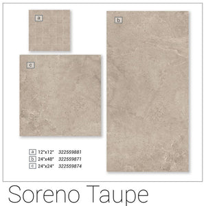 Create a warm and inviting space with the Soreno Taupe 24 in. x 24 in. Matte Porcelain Tile, featuring a stone-look design in soft taupe tones with subtle variations that replicate the beauty of natural stone. The matte finish enhances its smooth, refined surface, providing a modern yet understated appeal that complements a variety of styles. Its square format allows for versatile installation, delivering a seamless, balanced look suited for modern, classic, and transitional interiors. Ideal for floors, walls, showers, and accent areas, this durable porcelain tile is waterproof, easy to maintain, and designed for lasting beauty in residential and commercial applications.. Application Location: Backsplash,Floor,Wall. Break Strength (lb.): 300 lb. Color Family: Gray. Color/Finish: Taupe. Commercial / Residential: Commercial / Residential. DCOF Rating: Greater than or equal to 0.42. Edge Type: Rectified. Flooring Product Type: Porcelain Tile. Flooring and Tile Look: Stone Look. Indoor/Outdoor: Indoor,Outdoor. Installation Method: Mortar. Location: Bathroom,Garage,Kitchen,Shower. Minimum Acclimation Period: No Acclimation Required. Pool Location: Interior Pool. Pool PEI Rating: Inside Pool. Returnable: 90-Day. Shade Variation: V2 - Slight Variation. Shower Floor Compatibility: Not Compatible. Tile Features: Frost Resistant,Radiant/Underfloor Warming Heating. Tile Finish: Matte. Tile Format: Standard. Tile Material: Porcelain. Water Protection: Waterproof. Approximate Tile Size: 24x24. Product Length (in.): 24 in. Product Thickness (mm): 9.9 mm. Product Width (in.): 24 in. Suggested Grout Line Size: 1/8. Approximate Tile Size: 24x24. Tile Finish: Matte. Application Location: Floor. Flooring and Tile Look: Stone Look. Location: Bathroom. Location: Shower. Application Location: Wall. Location: Kitchen