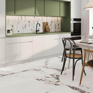 Introducing the Giorbello Mirage Porcelain Tile, a stunning testament to Spanish craftsmanship, renowned for its seamless fusion of marble style and durability. Expertly crafted in Spain, this collection embodies a refined, modern aesthetic that elevates both residential and commercial spaces. The Mirage Porcelain Tile is designed to deliver both elegance and functionality. Its sleek white finish and subtle gray texture, which mimics spider webs, provide a sophisticated look, while its exceptional resistance to wear, stains, and moisture makes it an ideal choice for high-traffic areas like kitchens, bathrooms, living spaces, floors, and walls. With its robust construction, it ensures long-lasting beauty and performance, no matter the environment. With a focus on premium quality and meticulous attention to detail, the Mirage Porcelain Tile not only enhances the aesthetic appeal of your space but also ensures long-lasting resilience. Transform your interiors with the understated elegance and reliable performance of the Giorbello Mirage Collection, where Spanish excellence meets everyday practicality. Application Location: Backsplash, Floor, Wall. Break Strength (lb.): 680 lb. Color Family: Gray. Color/Finish: Gray. Commercial / Residential: Commercial / Residential. DCOF Rating: Greater than or equal to 0.42. Edge Type: Rectified. Flooring Product Type: Porcelain Tile. Flooring and Tile Look: Marble Look. Indoor/Outdoor: Indoor, Outdoor. Installation Method: Mortar. Location: Bathroom, Countertop, Entry Way, Fireplace, Garage, Kitchen, Patio, Pool, Shower. Minimum Acclimation Period: No Acclimation Required. Pool Location: Interior Pool, Surrounding Pool. Pool PEI Rating: Inside Pool, Surrounding Pool. Shade Variation: V3 - Moderate Variation. Shower Floor Compatibility: Compatible. Tile Features: Chemical Resistant, Frost Resistant, Heat Resistant, Rectified Edge. Tile Finish: Matte. Tile Format: Standard. Tile Material: Porcelain. Water Protection: Waterproof. Approximate Tile Size: 12x24. Product Length (in.): 12 in. Product Thickness (mm): 9 mm. Product Width (in.): 24 in. Suggested Grout Line Size: 1/8. Approximate Tile Size: 12x24. Tile Finish: Matte. Application Location: Floor. Flooring and Tile Look: Marble Look. Location: Bathroom. Location: Shower. Application Location: Wall. Location: Kitchen.