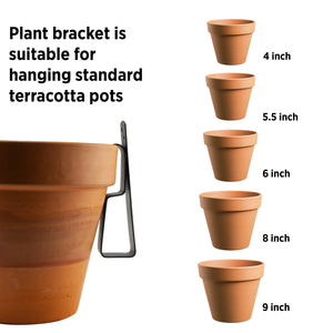 Running out of table top and shelf space to display your prized blooms? Try these unique clay pot hangers to create a vertical floral showcase. Just mount the durable steel hangers to a post, fence or wall then slide in the pot- securing the lip in the hanger. Screws and dry wall anchors are included. Unique steel pot holder slips over lip of pot to secure Fits pots with 2-in lip or less Screws and dry wall anchors are included Steel plant hanger features weather resistant black powder coated finish Color/Finish Family: Black Manufacturer Color/Finish: Black Type: Plant hanger Diameter (Inches): 0.98 Height (Inches): 5.7 Length (Inches): 1.73 Weight Capacity (lbs.): 0.24 Material: Steel Theme/Design: Functional Use Location: Indoor/Outdoor CA Residents: Prop 65 Warning(s): No UNSPSC: 31162500