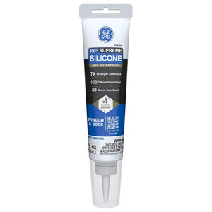GE Supreme Silicone Window and Door sealant is a 100% waterproof caulk that can provide a reliable seal in weather-prone areas such as windows, doors, basements, roofs, sidewalks, siding, tuckpointing, and attics. This caulk also has a 30-minute rain-ready formula and resists stain-causing mold and mildew growth. Our 100% silicone sealant offers 40% more flexibility than Class 25 sealants and 7x stronger adhesion than our Silicone 1 sealant. Plus, it offers 50% joint-movement capabilities without cracking, shrinking, breaking down, or washing away. GE Supreme Silicone Window and Door sealant is a premium caulk that has a low odor ideal for interior applications, and it won't discolor most high-end metal finishes such as chrome, bronze, and nickel.. Caulk and Sealant Application: Window & Door. Caulk and Sealant Type: Silicone. Color/Finish: Clear. Coverage (linear ft.): 10. Cure Time (hours): 24. Dry Color Family: Clear. Dry to Touch (min.): 30 min. Features: No Additional Features. Hub Required: No hub connection available. Indoor/Outdoor: Indoor/Outdoor. Interior/Exterior: Exterior. Kit: No. Number of Tubes Included: 1. Paint Tool Product Type: Sealants. Remote Access: No Remote Access. Requires Hub?: No Hub Required. Returnable: 90-Day. Sealant Form: Squeeze Tube. Voice Control Hub Required: No Voice Control. Works With: No additional compatibility. Certifications and Listings: No Certifications or Listings. Individual size (oz.): 2.8 oz. Caulk and Sealant Application: Window & Door. Caulk and Sealant Type: Silicone. Interior/Exterior: Exterior. Number of Tubes Included: 1