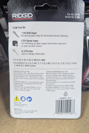 Add versatility with the RIDGID 3-Piece T-240 Tool Set (catalog number 12128) for RIDGID drum and sectional 3/8 in. cable (sold separately). Includes the T-202 bulb auger, T-211 spade cutter, and the A-13 pin key. The tool set features quick-locking tool ends for fast and easy change-out. Use the T-202 bulb auger for general-purpose cleaning to grab and hold blockages. The T-211 spade cutter helps poke holes in tough blockages and cut through grease. The auger and cutter heads can be changed out by sliding the tool head onto the 3/8 in. cable. With the head in place run the cable down the line to remove clogs. The A-13 pin is used to remove the pin when changing out the head. For use with the RIDGID K-40, K-45, K-50, and K-3800 machines (sold separately). RIDGID - Built For Those Who Know.. Maintenance, Repair & Supplies Product Type: Drain Openers & Chemicals. Pack Size: 1. Type: Other. Cable Length (ft.): 0. Cable diameter (in.): 3/8. Product Depth (in.): .05 in. Product Height (in.): 6 in. Product Width (in.): 4 in. Cable Length (ft.): 0. Cable diameter (in.): 3/8. Type: Other