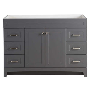 The 47.99 in. W Thornbriar bathroom vanity in cement features a 2-door cabinet below the sink and 3 full-extension drawers on each side. The 6 drawers maximize storage and organization space, while the 2-door cabinet provides easy access to your plumbing and additional storage. This dark gray freestanding vanity features a full-overlay design with Shaker-style door and drawer profiles. Brushed nickel door and drawer hardware completes this vanity. This vanity cabinet will fit a 49 in. W x 22 in. D vanity top, sold separately, allowing you to select a style that complements your bathroom decor. Designed for quick and easy installation around your existing plumbing, this pre-assembled bathroom vanity features an open-back design, adjustable cabinet hinges, and adjustable drawer faces.. Cabinet Color: Cement. Cabinet Color Family: Gray. Cabinet Material: Particle Board. Cabinet Shade: Dark. Hardware Finish Family: Nickel. Included: No Additional Included Components. Mirror Included: Mirror Not Included. Number of Drawers: 6. Number of Shelves Included in Cabinet: 0. Style: Transitional. Vanity Features: Adjustable Hinges,Fully Extendable Drawers. Vanity Type: Freestanding. Product Depth (in.): 21.52 in. Product Height (in.): 34.21 in. Product Width (in.): 47.99 in. Mirror Included: Mirror Not Included. Width (in.): 47.99 in. Cabinet Material: Particle Board. Vanity Type: Freestanding. Included: No Additional Included Components. Style: Transitional. Cabinet Shade: Dark. Number of Drawers: 6