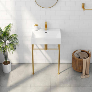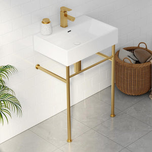 Eridanus' new console sink adds a versatile style to your bathroom, blending vintage charm with modern convenience. This 24 in. basin is made from durable vitreous china and is supported by sturdy brushed gold metal legs. This console sink is also equipped with 2 colors, the choice of consoles with different colors can better fit your unique decoration style. The long-lasting purity and adaptability of white make it an excellent choice for lighting fixtures that can easily coordinate with any design. The overall smooth glazed finish adds a touch of sophistication to the bathroom decoration and can visually upgrade the bathroom space.. Color Family: White. Color/Finish: White & Brushed Gold. Drain Finish: Not Applicable. Faucet Hole Spacing (in.): No Spacing - Single Hole. Features: Fade Resistant,Handmade,Rust Resistant,Scratch Resistant. Finish Family: Stainless Steel. Included: Mounting Hardware. Material: Vitreous China. Number of Legs: 2. Overflow location: Front. Product Weight (lb.): 44.8 lb. Shape: Rectangular. Certifications and Listings: CE Certified. Bathroom Sink Front to Back Width (In.): 16.5. Bathroom Sink Left to Right Length (In.): 24. Bathroom Sink Top to Bottom Depth (in.): 5.75. Inner bowl front to back length (in.): 11.75. Inner bowl side to side width (in.): 22.625. Product Depth (in.): 16.5 in. Product Height (in.): 35.5 in. Product Width (in.): 23.875 in. Finish Family: Stainless Steel. Bathroom Sink Left to Right Length (In.): 24. Drain Finish: Not Applicable. Width (in.): 23.875 in. Faucet Hole Spacing (in.): No Spacing - Single Hole. Shape: Rectangular. Material: Vitreous China. Included: Mounting Hardware