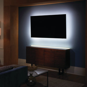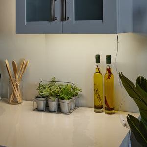 COB LED technology provides evenly distributed lighting - ideal for professional installations and commercial applications. Linkable up to 32 ft with End-to-End connectors or linking cords (included). This light is cuttable and able to rejoin for customized length to fit your needs. More flexible than conventional LED tape lights easier to fit into tight areas and turn around corners. High Color Rendering Index CRI 90 which is close to natural sunlight, lights up objects in their true and natural colors. Dimmable down to 5% with built-in slide dimmer switch. Damp rated for indoor use. Easy peel-and-stick installation with direct plug-in to power. Color Temperature (Kelvins): 4000. Light Color: Cool White. Type: Tape. Bulb Type: LED. Dimmable: Yes. Energy Efficient: Yes. Linkable: Yes. Lowe's Exclusive: Yes. Lumens: 4000. Motion Sensor: No. Power Source: Plug-in. Remote Control Included: No. CA Residents: Prop 65 Warning(s): Yes. ENERGY STAR Certified: No. Safety Listing: ETL safety listing. UNSPSC: 39112000.