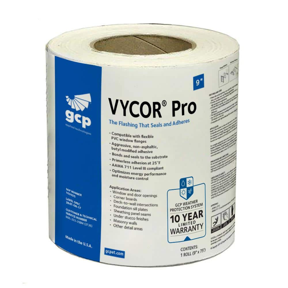 Grace Vycor Pro flashing, with its unique film and non-asphaltic, butyl-modified adhesive, provides premium protection against water infiltration in critical details, such as windows and doors. The special adhesive formulation provides a wide application temperature range for year round versatility in any climate. When installed properly, Vycor Pro flashing tape reduces the risk of mold and rot development and contributes to energy efficiency.. Color Family: White. Hardware Included: No. Material: Plastic. Product Weight (lb.): 28 lb. Returnable: 90-Day. Window Type: Other. Product Depth (in.): 0.014 in. Product Height (in.): 900 in. Product Length (in.): 900. Product Width (in.): 9 in