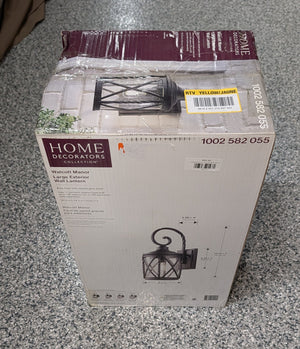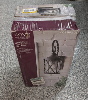 A one-light wall lantern featuring a Craftsman-inspired silhouette. The clear seeded glass and Black finish enhance a variety of home exteriors. The elongated frame provides additional visual interest with a combination of scrolling and linear details.. Black finish. Clear seeded glass. 8 in. width x 18-3/4 in. height. Uses (1) 100-Watt medium base bulb (not included). Wet location listed. Scrolling and linear details. Craftsman inspired design. For design inspiration, Click here for exterior front of home trend ideas . Click here to learn more about exclusive Home Decorators Collection products . Sconce Type: Lantern. Number of Lights: 1 Light. Power Source: Hardwired. Light Direction: Down. Fixture Material: Aluminum. Damp/Wet Rating: Wet Rated. Durability: Weather Resistant. Glass Type: Seeded Glass