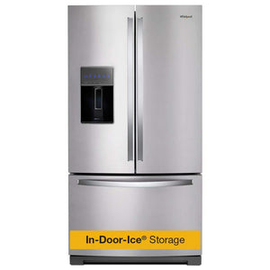 Get more room with purposeful storage spaces for the items you use most in this french door refrigerator with large freezer. Features such as the platter pocket, IN-DOOR-ICE storage, LED lights and a deli drawer make your family's favorites easy to fit and find. This ENERGY STAR refrigerator also has a fingerprint-resistant exterior that resists smudges and easily wipes clean.. Keep wide, flat items out of the way with the platter pocket. Resists fingerprints and smudges with steel that's easy to clean. Get an extra full shelf with an ice bin that's moved to the door. Wide, flat items like brownie pans, lasagna and pizza boxes stay tucked out of the way in this space designed to keep them safe from stacking.. Resists fingerprints and smudges with steel that easily wipes clean. Available in Black Stainless Steel and Stainless Steel finishes.. Get an extra full shelf in the refrigerator with an ice bin that's been moved to the door.. Access fresh filtered water and ice without ever opening the refrigerator door.. ENERGY STAR certified models exceed government standards to help save money on your utility bills.. Store fruits and vegetables in their ideal environment with humidity controlled crispers.. Easily store frozen pizzas upright without the hassle of trying to fit them on flat freezer shelves.. Move the adjustable bins anywhere in the door for increased loading flexibility when and where you need it.. Easily organize frozen favorites with two tiers of storage.. Simplify cleanup with shelves that help contain spills and prevent liquids from leaking below.. Store plenty of meat and cheese with a deli drawer.. Keep food looking as good as it tastes. Light is cast inside the refrigerator so food looks like it's supposed to.. Clean the tap touch controls as easily as you use them.. Click here to shop for more Whirlpool Appliances . . Click here to learn more about Eco Options and Energy Efficiency . . Appliance Category: Refrigerator. Appliance Series: Not Applicable. Appliance Type: French Door Refrigerator. Built-In and Standard Type: French Door. Color - Appliance Cabinet: Gray. Color - Door Handle(s): Stainless Steel. Color/Finish: Fingerprint Resistant Stainless Steel. Color/Finish Family: Stainless Steel. Defrost Type: Auto / Cycle. Dispenser Location: External Ice Dispenser. Door Finish: Smooth. Energy Consumption (kWh/year): 710. Energy Efficiency Tier Rating: Not CEE rated. Freezer Capacity (cu. ft.): 7.77 cu ft. Freezer Door Type: Pull Out Drawer. Freezer Features: LED Light Type. Freezer Type: Drawer Freezer. General Features: Door Alarm,Interior Light,LED Light Type. Handle Type: Bar Handle. Hardware Color/Finish: Fingerprint Resistant Stainless Steel. Hardware Color/Finish Family: Stainless Steel. Ice Maker Features: Filtered Ice,Lighted Bin. Ice/Water Dispenser: Both. Indoor/Outdoor: Indoor,Outdoor. Installation Depth: Standard Depth. Installation Type: Built-In. Number of Doors: 3 Door. Number of Drawers: Single Drawer. Number of Freezer Baskets/Bins: 2 Baskets/Bins. Number of Freezer Shelves: No Shelves. Number of Refrigerator Shelves: 5 Shelves. Operational Features: Humidity Control. Overall Product Height (in.): 70 in. Product Weight (lb.): 327 lb. Refrigeration Dispenser Features: Crushed Ice,Cubed Ice,Dispenser Control Lock-Out,Filtration Replacement Indicator Light,Water Filtration. Refrigerator Capacity (cu. ft.): 19.0 cu ft. Shelf Material - Freezer: No Shelf. Shelf Material - Refrigerator: Glass. Storage Features: Adjustable Door Storage,Gallon Door Storage,Pizza Box Slot. Temperature Control Type: Internal Electric. Total Capacity (cu. ft.): 26.8 cu ft. Water Filter Replacement Model#: EDR2RXD1. Certifications and Listings: AHAM Certified,UL Listed. Depth (Excluding Handles) (in.): 33.25 in. Depth (Including Handles) (in.): 35.63 in. Depth (Less Door) (in.): 28.88 in. Depth With Door Open 90 Degrees (in.): 48 in. Height to Top of Door Hinge (in.): 70.13 in. Height to Top of Refrigerator Case (in.): 68.75 in. Height to Top of Refrigerator Door (in.): 70.125 in. Product Depth (in.): 35.63 in. Product Height (in.): 70.13 in. Product Width (in.): 35.69 in. Refrigerator Width (in.): 36 in