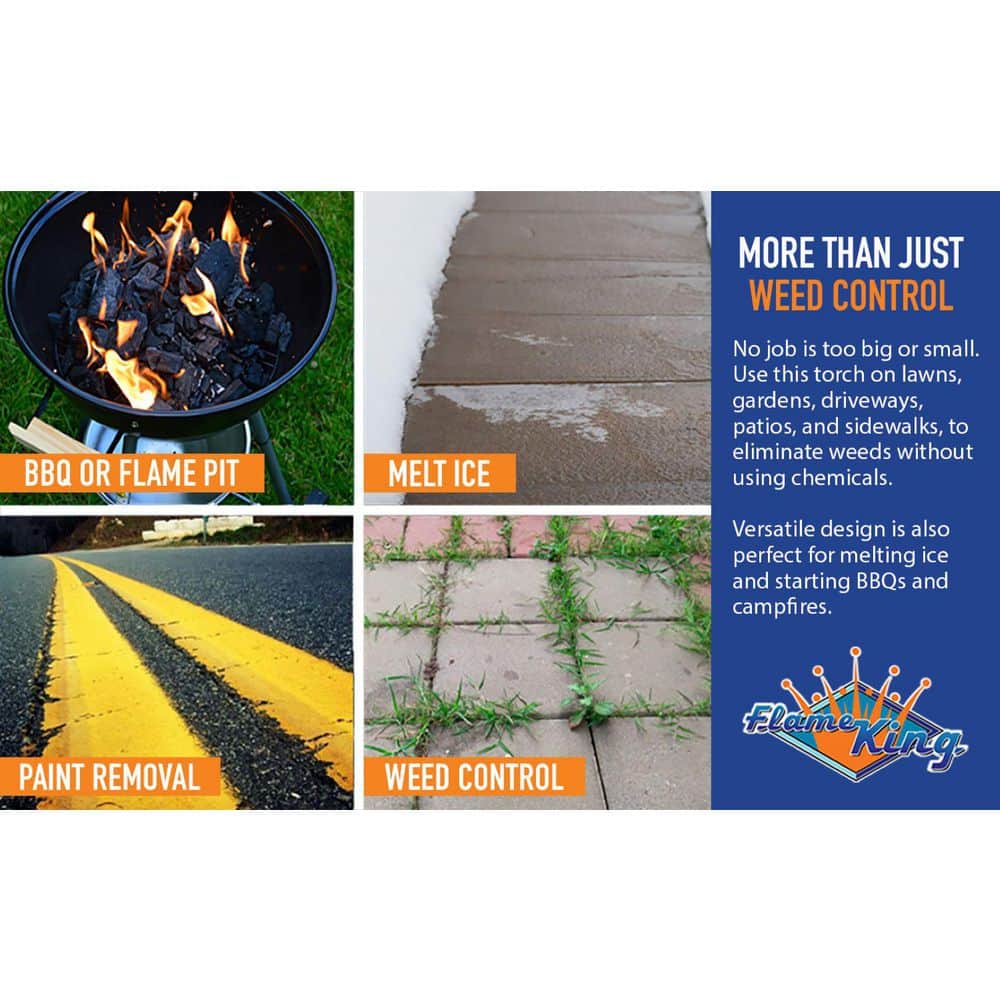 The Flame King Wide Flame Propane Torch Weed Burner works great to remove weeds from your lawn, gardens, asphalt, and gravel driveways and so much more. The Wide burner tip is designed to cover more ground, saving you valuable time. It is also designed with a molded, non-slip handle for added grip control and comfort. The Flame King Wide Flame Propane Torch arrives fully assembled and ready to use. This is the ideal torch for your every day weed removal. This torch is compatible with any standard 1-pound camping propane cylinder. The Flame King Weed Burner is self igniting and includes an adjusting valve to control the flame. Please note: Flame King 1LB refillable propane cylinder not included.. Fuel Type: Propane Liquid. Included: No Additional Items Included. Pack Size: 1. Product Weight (lb.): 1.2 lb. Torch Cooling Method: Air Cooled. Torch Head Type: Rigid. Product Depth (in.): 38 in. Product Height (in.): 2 in. Product Width (in.): 4 in. Fuel Type: Propane Liquid. Torch Head Type: Rigid. Torch Cooling Method: Air Cooled